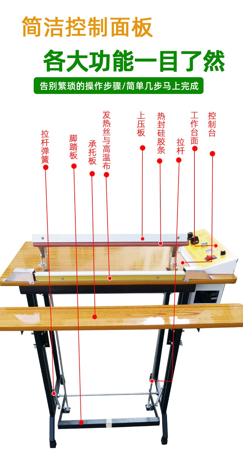 - 腳踏裝置:腳踏板是腳踏封口機的重要組成部分,通常設計有防滑紋理,以確保操作人員踩踏時的安全性和穩定性。腳踏板通過連桿與封口部件相連,連桿一般由金屬材質制成,具有足夠的強度和韌性,能有效傳遞力量。