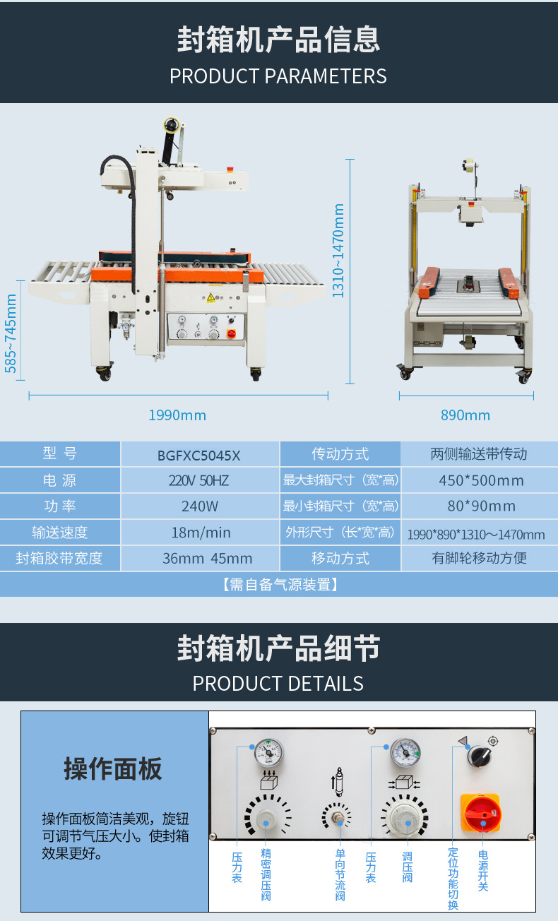 - 環(huán)境要求:封箱機(jī)應(yīng)放置在干燥、通風(fēng)、無(wú)塵的環(huán)境中,避免在潮濕、高溫或有腐蝕性氣體的場(chǎng)所使用,以免影響設(shè)備的性能和壽命。