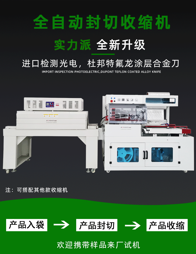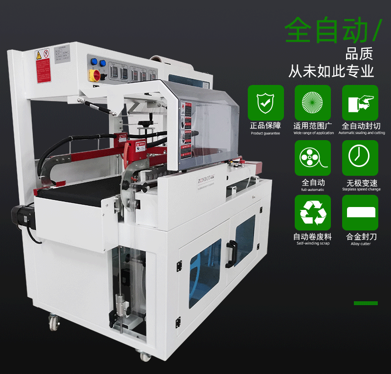 全自動封切熱收縮機適用于手機、平板電腦、電子配件等電子產品的包裝,起到防塵、防潮、防靜電的作用,保護電子產品在運輸和銷售過程中不受損