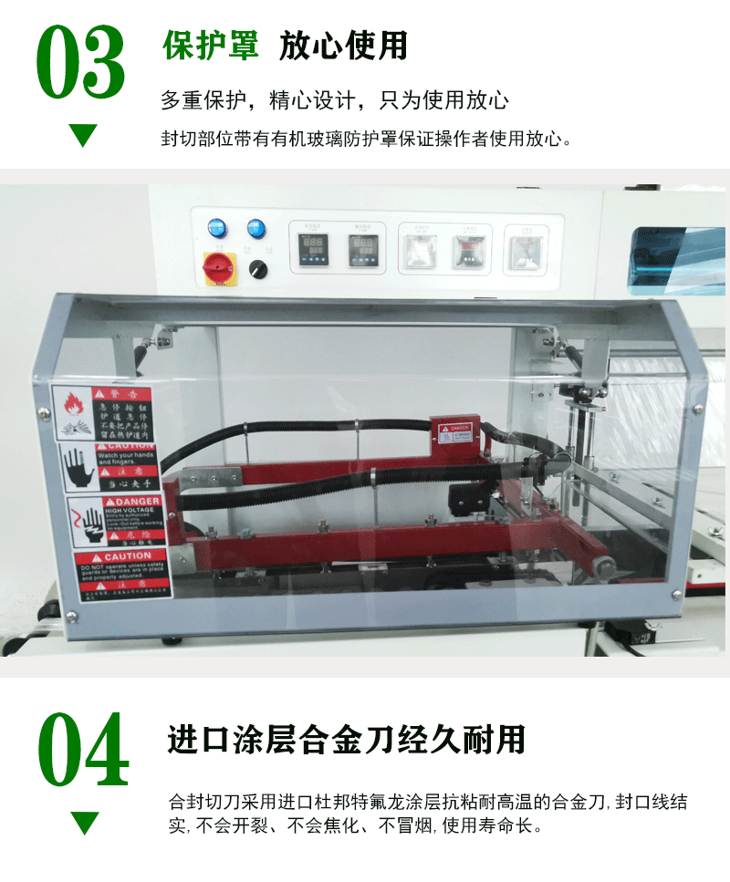 - 保護功能完善:封切部分裝有有機玻璃保護罩,并帶有自動報警功能,可大大提高操作者的安全性。封切刀帶有自動保護功能,能有效防止誤切包裝物14。