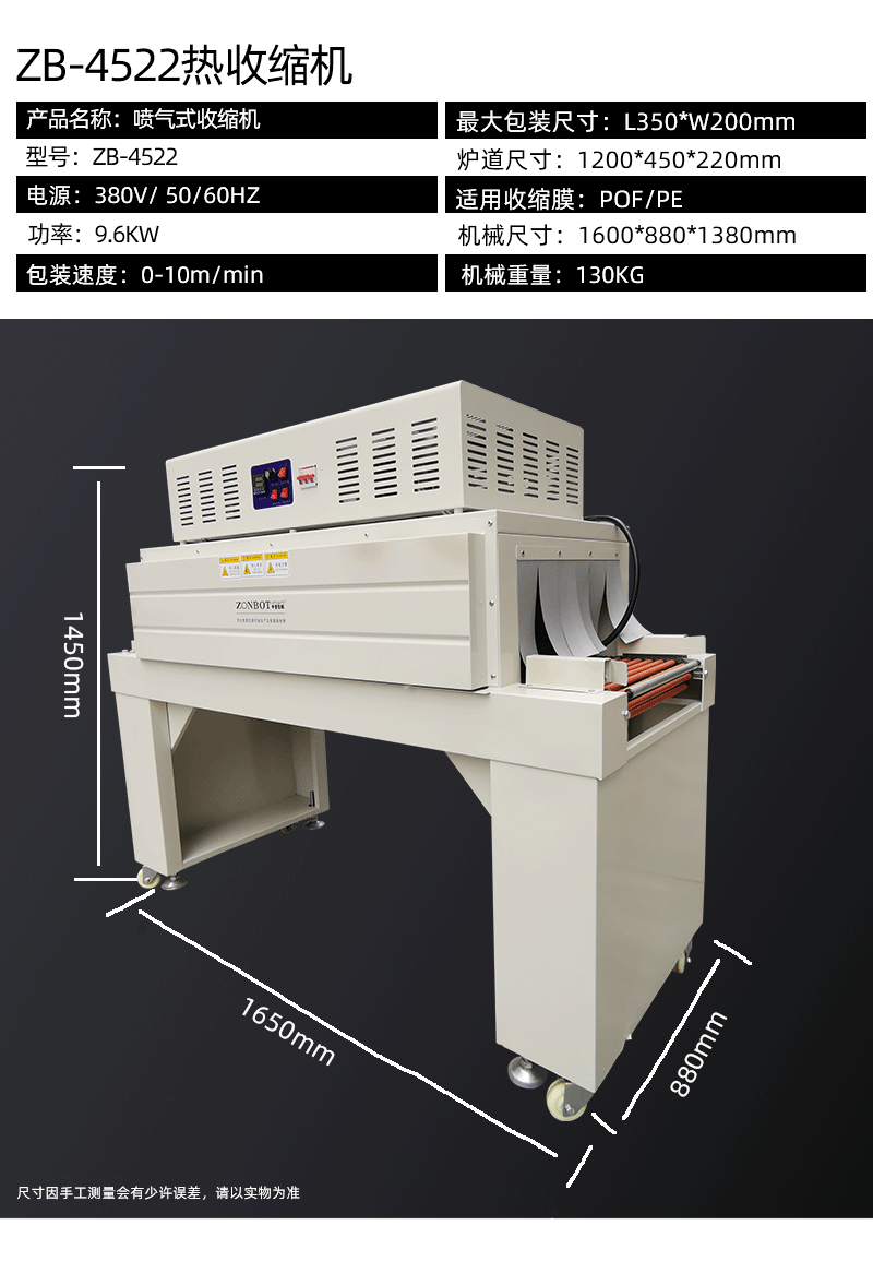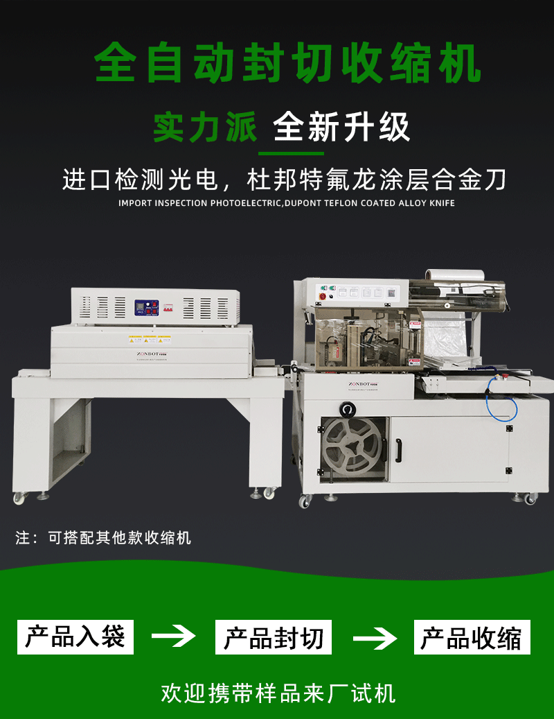 - 薄膜輸送與套膜:與此同時,熱收縮薄膜(常見材質如 PVC、PE、PP 等)會從薄膜卷軸上被源源不斷地輸送出來。當物品被輸送到合適位置時,薄膜會在相關機構的作用下,自動套在待包裝物品的外圍,形成初步的包裹狀態。