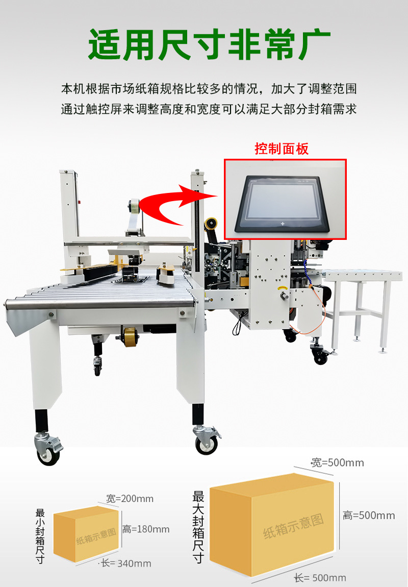- 精確的膠帶粘貼:通過精密的導向裝置和控制系統,能夠確保膠帶在紙箱的上下封口和中間接縫處精確粘貼。膠帶位置準確、整齊,形成標準的 “工” 字形,使紙箱外觀更加美觀、專業,同時也增強了封口的密封性。