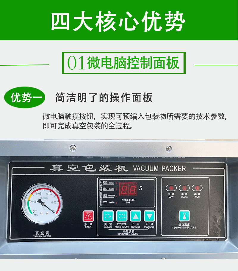 - 通過控制面板可以精確地設置真空度,能夠滿足不同產品對真空環境的要求。例如,對于一些對氧氣特別敏感的藥品,能夠將包裝袋內的真空度設置到較低水平,有效延長藥品的保質期。