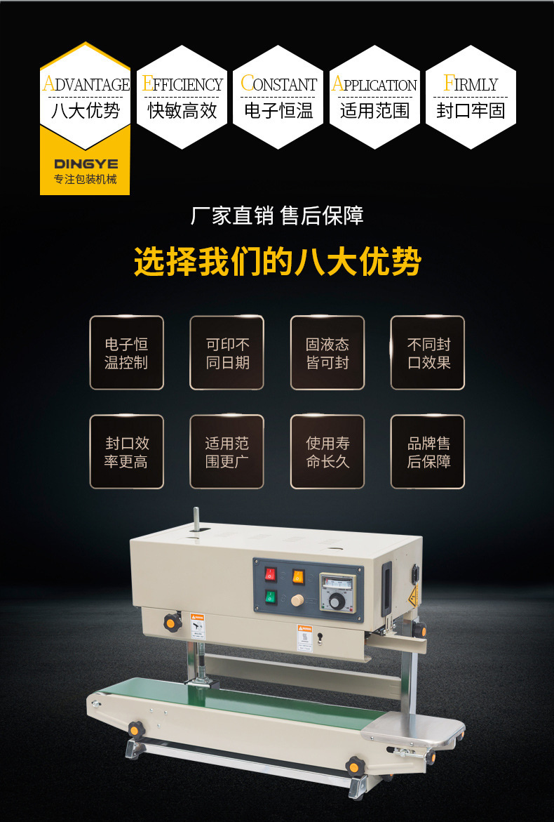 立式連續封口機適用于各種塑料薄膜的封口及制袋,如鋁箔袋、塑料袋、復合袋等