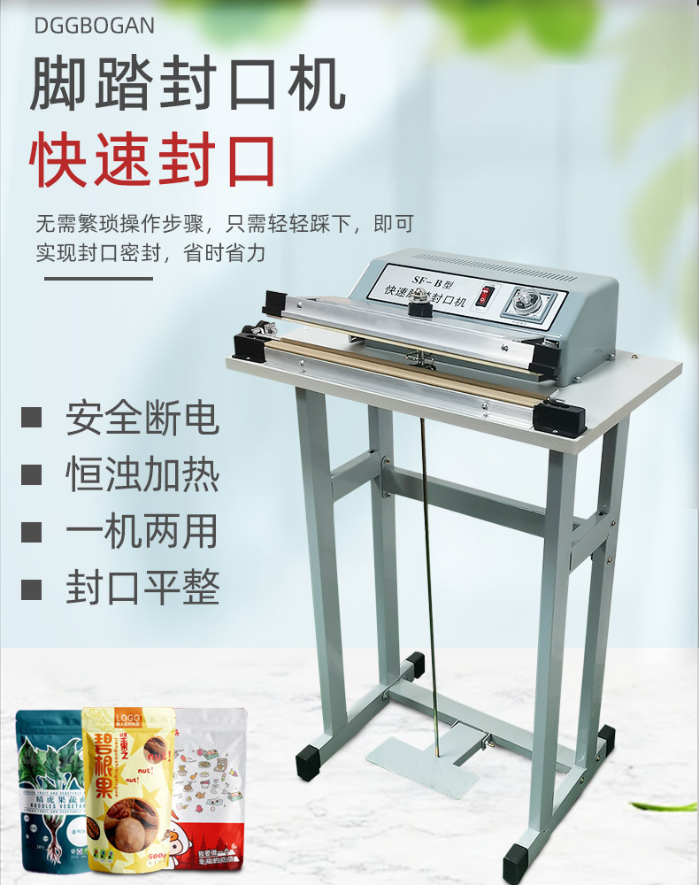 腳踏封口機是一種理想的封口設備,?適用于各種塑料袋薄膜的封口及制袋。?它特別適用于醫藥、?農藥、?食品、?日化、?潤滑油等行業的鋁箔袋、?塑料袋、?復合袋的封口。?這種設備利用電氣脈沖技術,?能夠顯著縮短封口時間,?從原來的2-4秒縮短至0.2秒,?具有投資少、?效益高、?封口長度長、?操作簡單等特點。?因此,?腳踏封口機被廣泛應用于食品、?醫藥、?土特產、?電器軟件、?工廠、?商店、?服務行業等領域,?成為這些行業中不可或缺的封口設備
