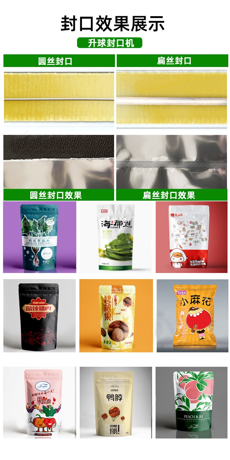 升球牌是根據國內外先進的機型基礎上,重新設計制造而成,適用于所有塑料袋薄膜封口及制袋,是食品廠,化妝品廠,藥廠等單位的理想封口設備。適用范圍 適用于醫藥,農藥,食品,日化,潤滑油等行業的鋁箔袋,塑料袋,復合袋理想封口機械