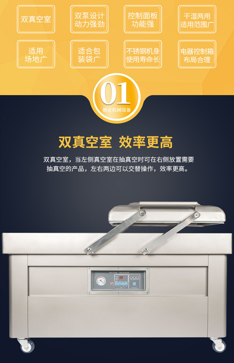 總之,雙室真空包裝機憑借其高效、多功能和可靠的特點,在各個行業中都發揮著不可或缺的作用,為產品的優質包裝和保存提供了有力支持。