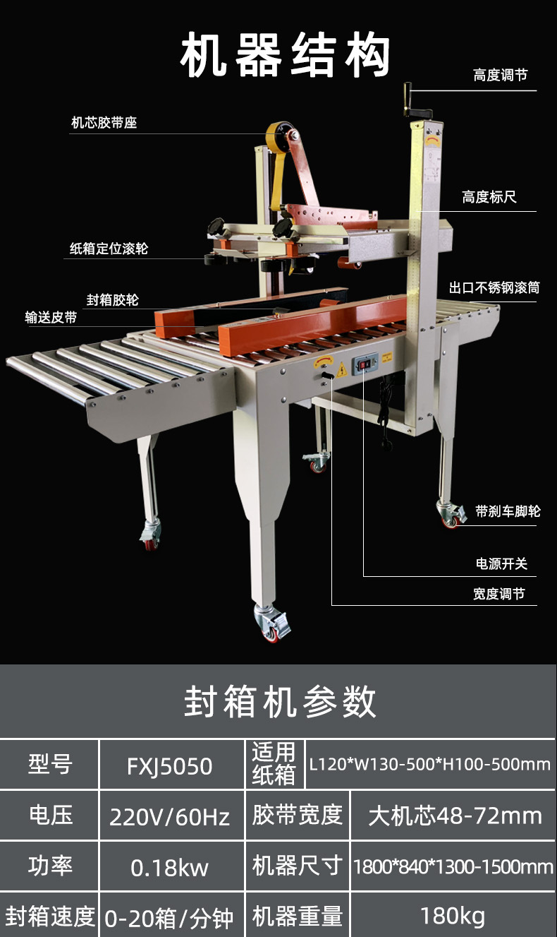 - 封箱:封箱機(jī)構(gòu)使用膠帶對(duì)紙箱進(jìn)行封口,通常可以選擇不同寬度的膠帶以滿足不同的封箱需求。