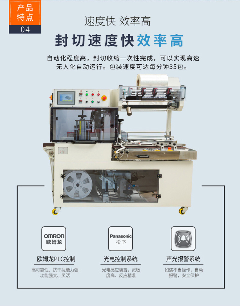 全自動封切機主要由送膜系統、輸送系統、封切系統和控制系統組成。