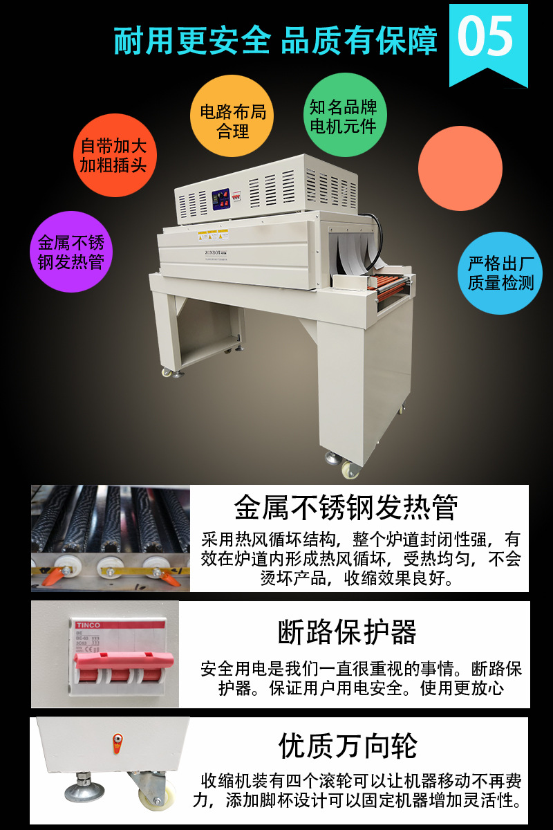- 輸送帶:負責將待包裝物品平穩(wěn)地輸送通過各個工作區(qū)域,如套膜區(qū)、加熱區(qū)等。輸送帶的速度通常是可調(diào)節(jié)的,以便適應不同的包裝速度要求。