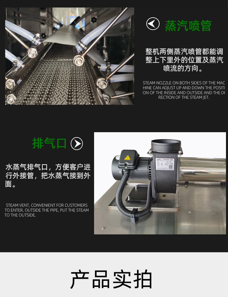 - 蒸汽收縮能夠使包裝膜緊密貼合產品,相比其他熱收縮方式(如熱風收縮),蒸汽的熱傳遞更加均勻,不會出現局部過熱導致包裝膜變形或破裂的情況,從而獲得更加美觀、平整的包裝外觀。