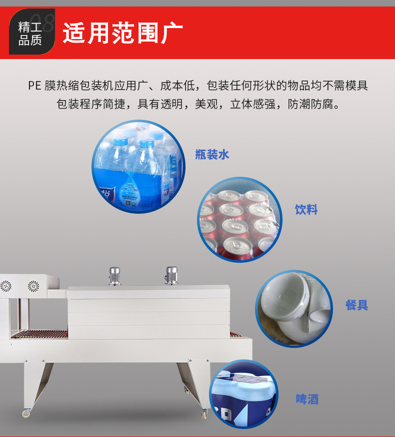 適用范圍廣:可以用于包裝各種形狀和尺寸的產(chǎn)品,無論是規(guī)則的圓柱體、長方體,還是不規(guī)則的產(chǎn)品,只要選擇合適的 PE 薄膜,都可以用這種機(jī)器進(jìn)行包裝。而且它可以與其他包裝設(shè)備和生產(chǎn)線集成,實(shí)現(xiàn)自動化包裝,提高生產(chǎn)效率。