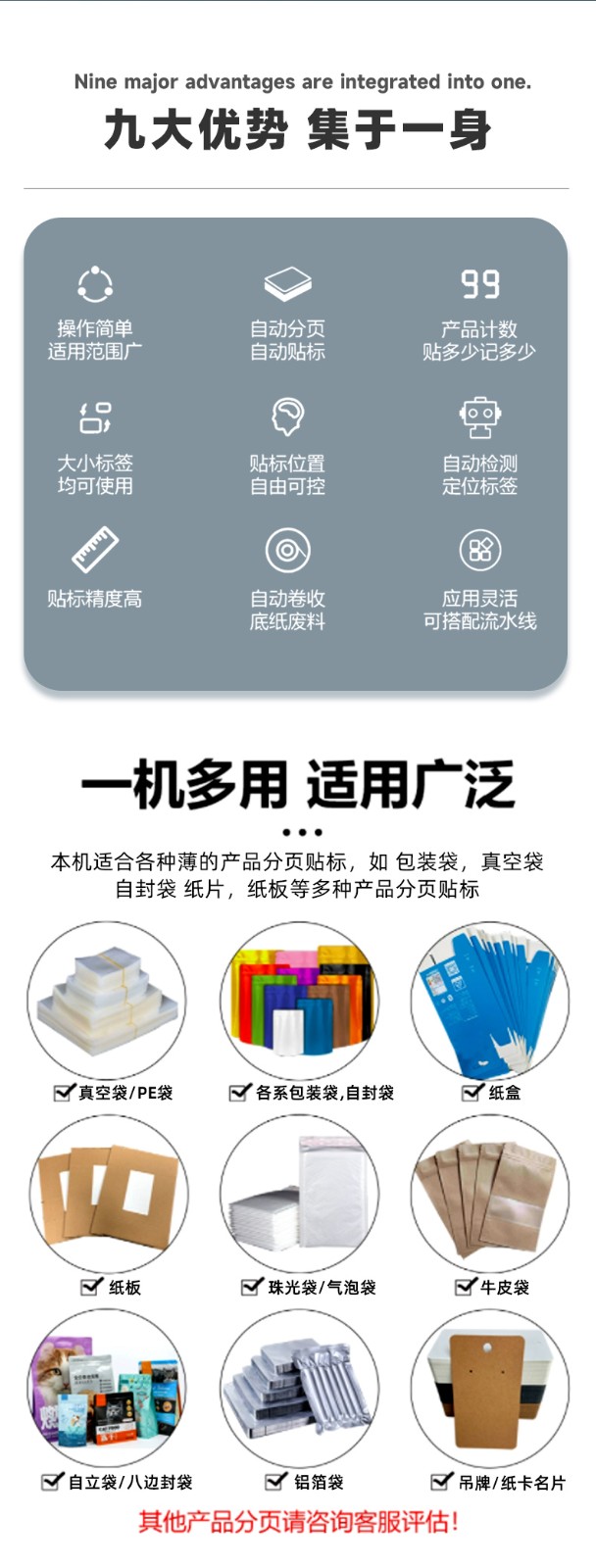在現代化生產浪潮中,企業對高效、精準的包裝與標識環節需求極為迫切。全自動分頁貼標機憑借卓越性能,成為眾多行業提升生產效率、保障產品質量的得力助手。