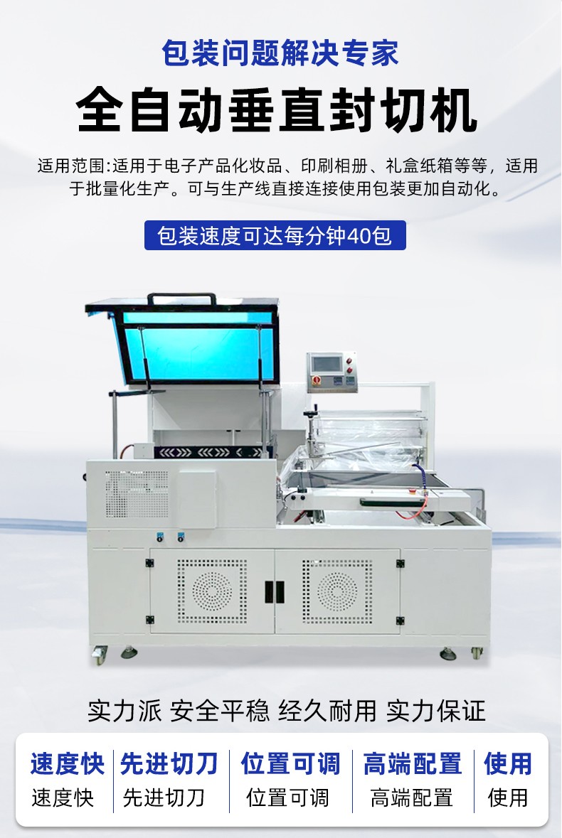 全自動(dòng)垂直封切熱收縮包裝機(jī)是一款集 “自動(dòng)封切” 與 “熱收縮定型” 于一體的高效包裝設(shè)備,核心優(yōu)勢(shì)在于垂直方向完成封切動(dòng)作,適配多尺寸、多形態(tài)產(chǎn)品,且包裝后能形成緊密、規(guī)整的保護(hù)膜,兼具防護(hù)性與美觀性,廣泛應(yīng)用于食品、醫(yī)藥、日化、電子等多個(gè)行業(yè)。以下從核心結(jié)構(gòu)、工作原理、關(guān)鍵優(yōu)勢(shì)、適用場(chǎng)景及選型注意事項(xiàng)五個(gè)維度,全面解析該設(shè)備: