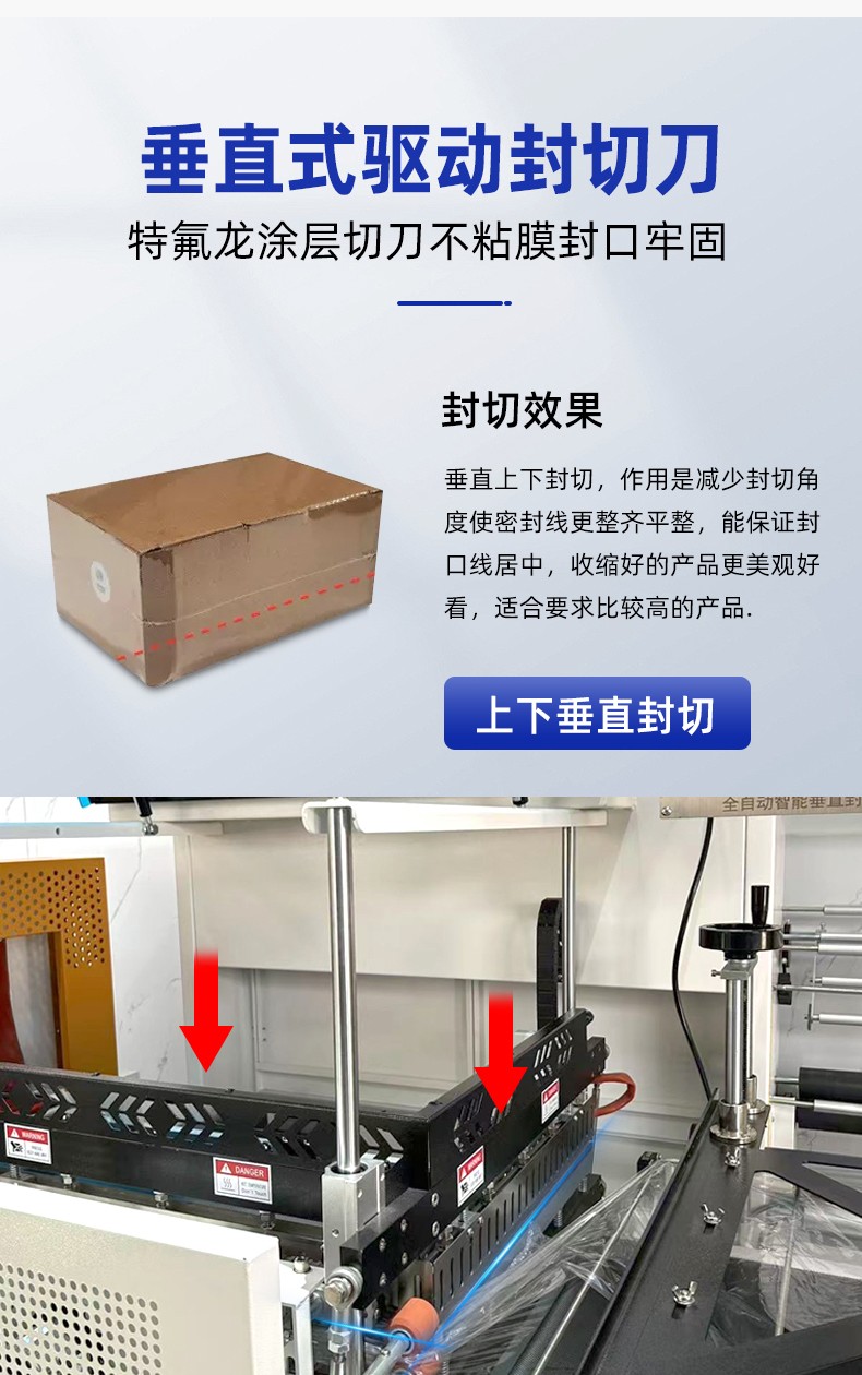 存放熱收縮膜卷(如 POF、PVC、PE 膜),配備自動(dòng)張力控制器,確保膜材勻速、平穩(wěn)輸送,避免膜材褶皺或斷裂(部分機(jī)型支持 “雙膜卷切換”,減少換膜停機(jī)時(shí)間)。 - 垂直封切機(jī)構(gòu):