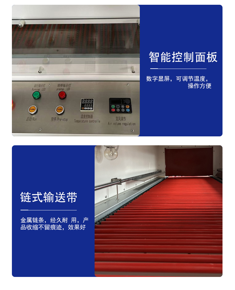 封切后的 “膜 + 產(chǎn)品” 進(jìn)入通道,內(nèi)部通過熱風(fēng)循環(huán)系統(tǒng)(多組發(fā)熱管 + 離心風(fēng)機(jī))產(chǎn)生均勻熱風(fēng),使膜材受熱收縮并緊密貼合產(chǎn)品表面;通道溫度、風(fēng)速、輸送速度可精準(zhǔn)調(diào)節(jié),適配不同材質(zhì)的膜(如 POF 膜需 120-180℃,PE 膜需 180-220℃)。 - 輸送系統(tǒng):