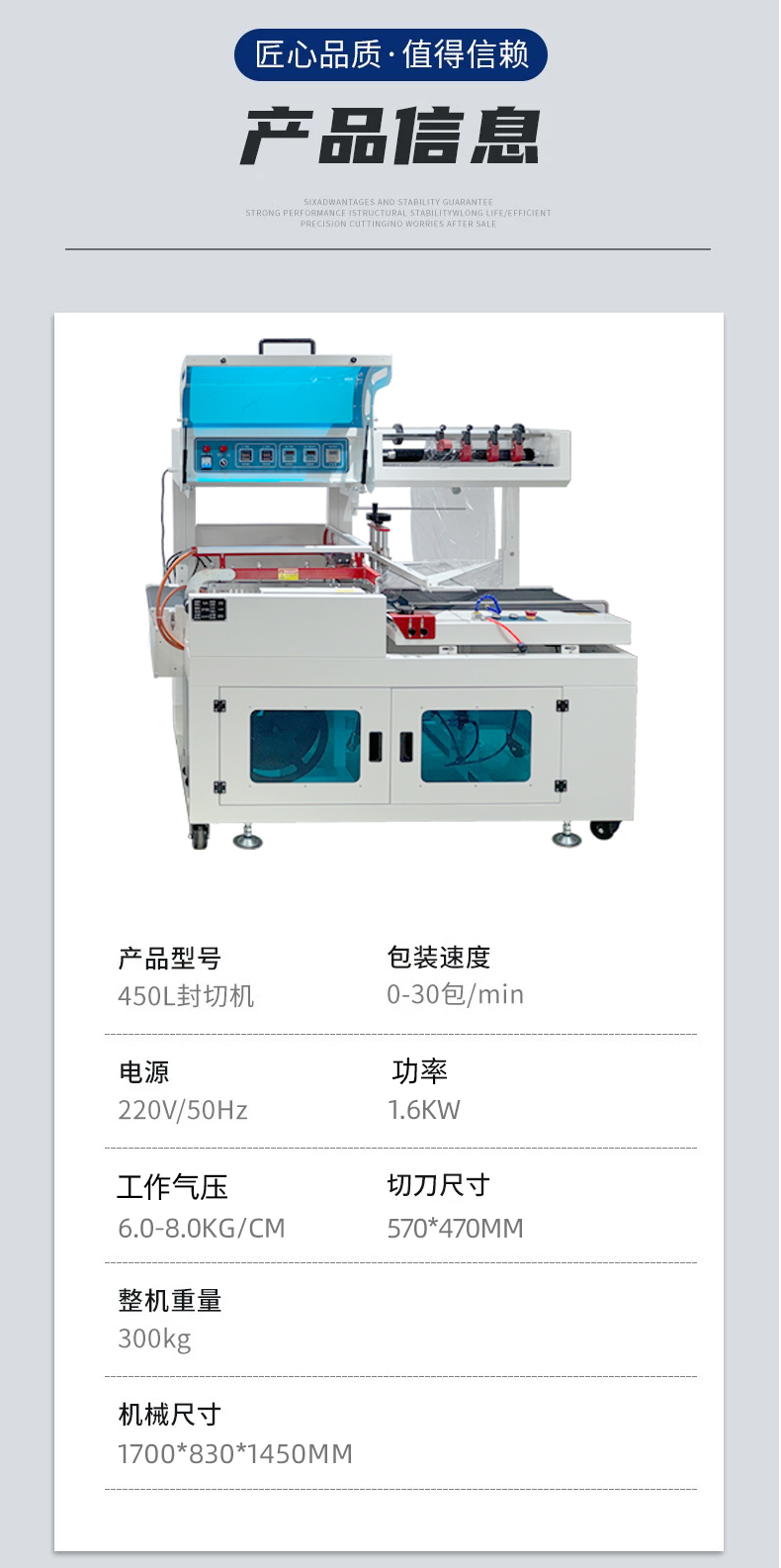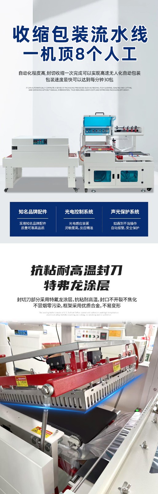 2. L 型封切單元L 型封切刀、加熱條、切刀、廢膜回收架完成 “熱封 + 切斷” 一體化動作,封切刀溫度可精準調節(通常 150-250℃),確保封邊牢固不滲漏