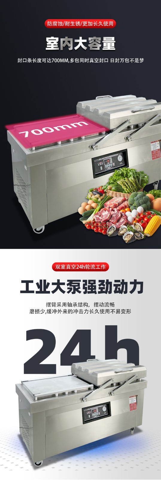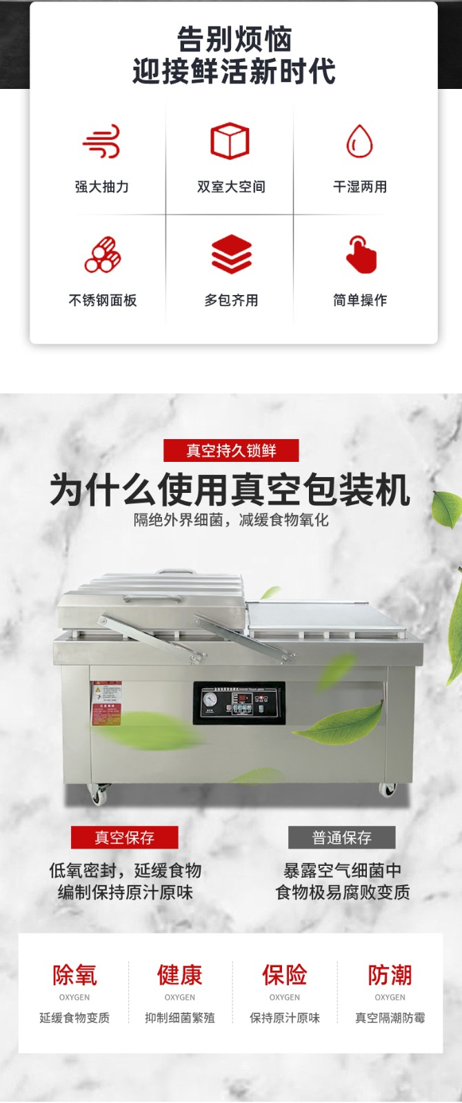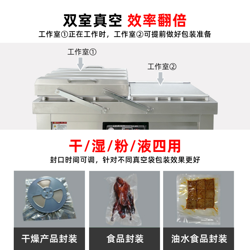 雙室真空包裝機通過 “雙真空室輪換作業(yè)” 實現(xiàn)抽真空與裝袋無縫銜接,核心是利用兩個獨立真空室的 “時間差并行操作”,讓設(shè)備在同一周期內(nèi)同時完成 “抽真空密封” 和 “人工 / 自動裝袋”,徹底消除單室機型 “抽真空時無法裝袋” 的等待間隙,大幅提升作業(yè)效率。其具體運作邏輯和優(yōu)勢可拆解為以下 3 點: