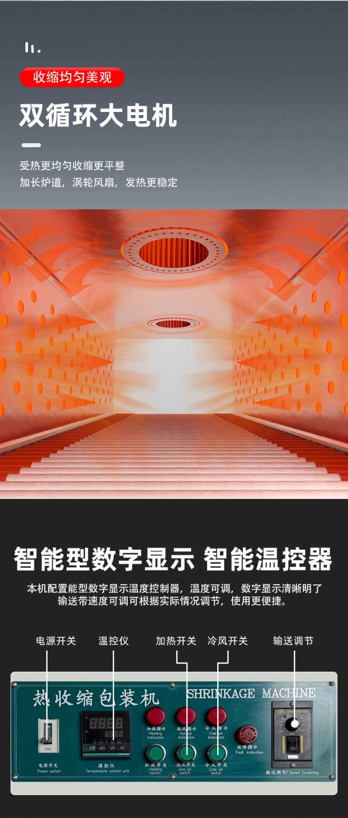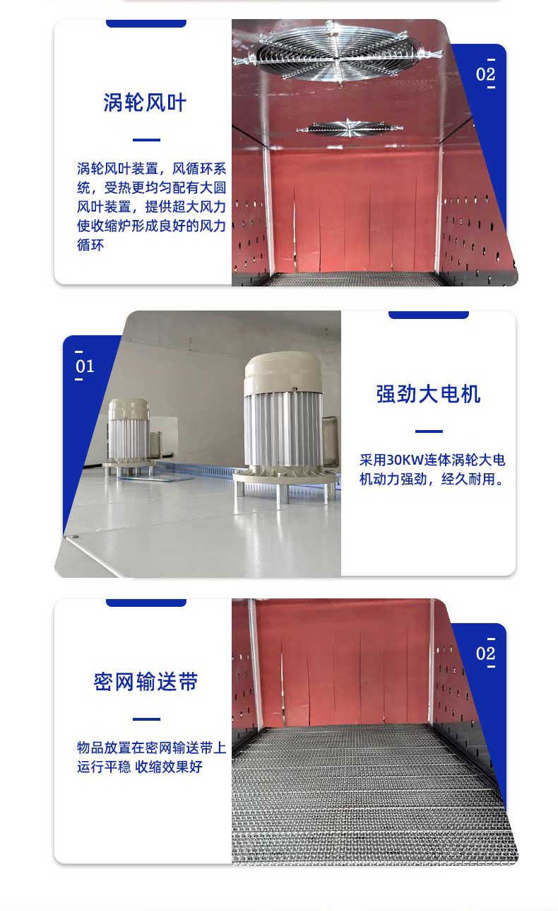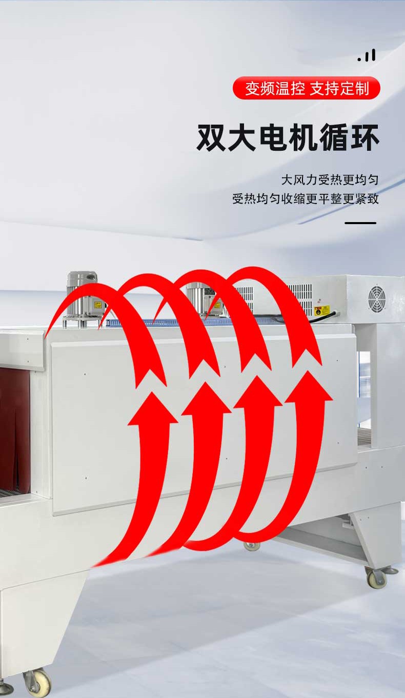 - 熱收縮定型:封切后的產品進入熱收縮區,這里有高溫熱風循環系統,使膜材均勻收縮,緊密貼合產品輪廓。比如有的設備采用螺旋風道設計,能有效提升收縮效率。
