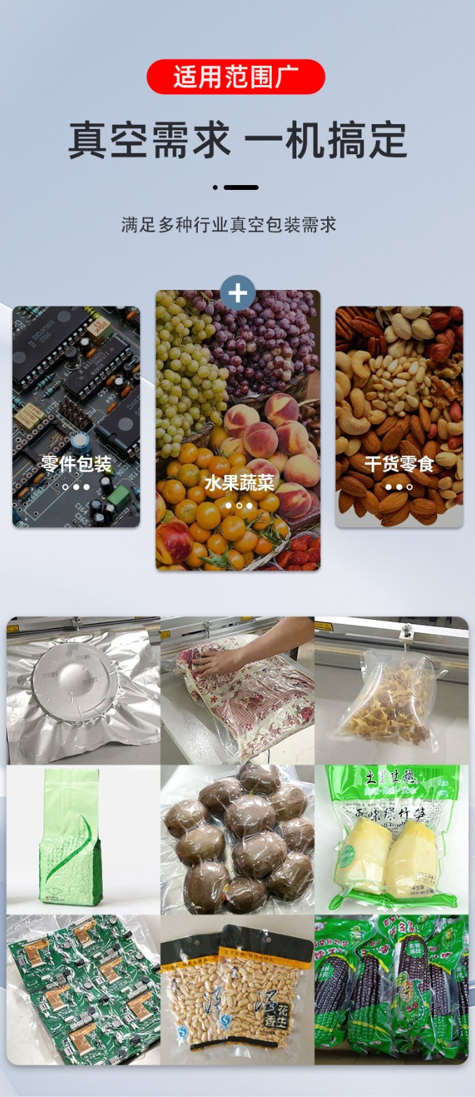 - 工業領域:大型機械零件、金屬構件、整箱電子元件的真空包裝,防止運輸中受潮、生銹。