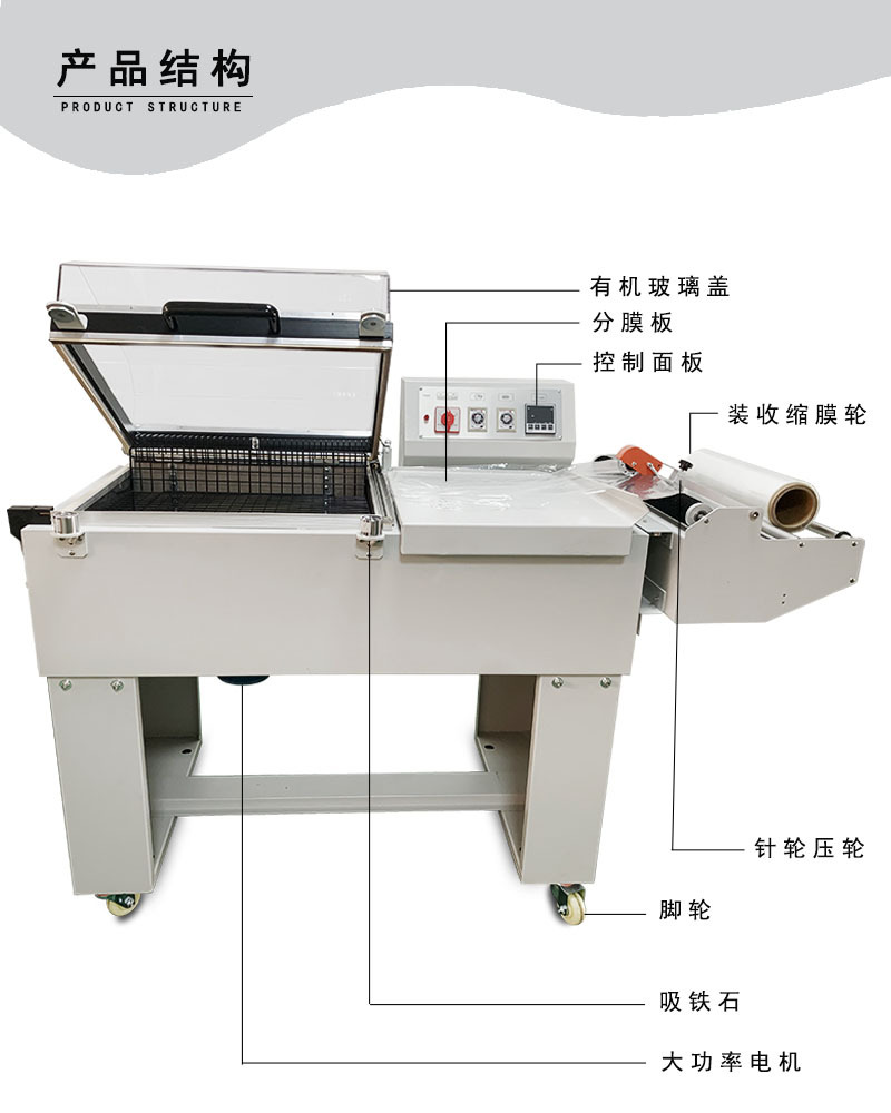 PRODUCT CENTER熱收縮機(jī)的工作原理很簡(jiǎn)單,首先需要將物品放入機(jī)器內(nèi)部,然后調(diào)整好收縮溫度、收縮時(shí)間和速度等參數(shù),接下來就讓機(jī)器自動(dòng)為你搞定一切吧!經(jīng)過收縮處理的物品不僅外觀更加美觀,而且可以提高物品的耐壓、耐磨性能,延長(zhǎng)物品的使用壽命。