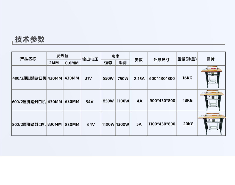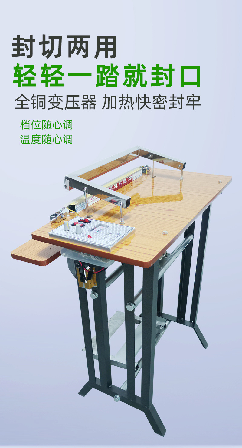 腳踏式封口機(jī)適用于各種塑料薄膜、復(fù)合薄膜及鋁塑薄膜的封合。產(chǎn)品簡(jiǎn)介 可廣泛應(yīng)用于食品、土特產(chǎn)、糖果、茶葉、醫(yī)藥、五金等行業(yè)。技術(shù)參數(shù) 產(chǎn)品優(yōu)點(diǎn) 1、本品適用于藥品,化妝品,保健品,食品,潤(rùn)滑油,農(nóng)藥,蜂蜜,瓜子,洗衣粉,大棗,調(diào)味品,雞精等